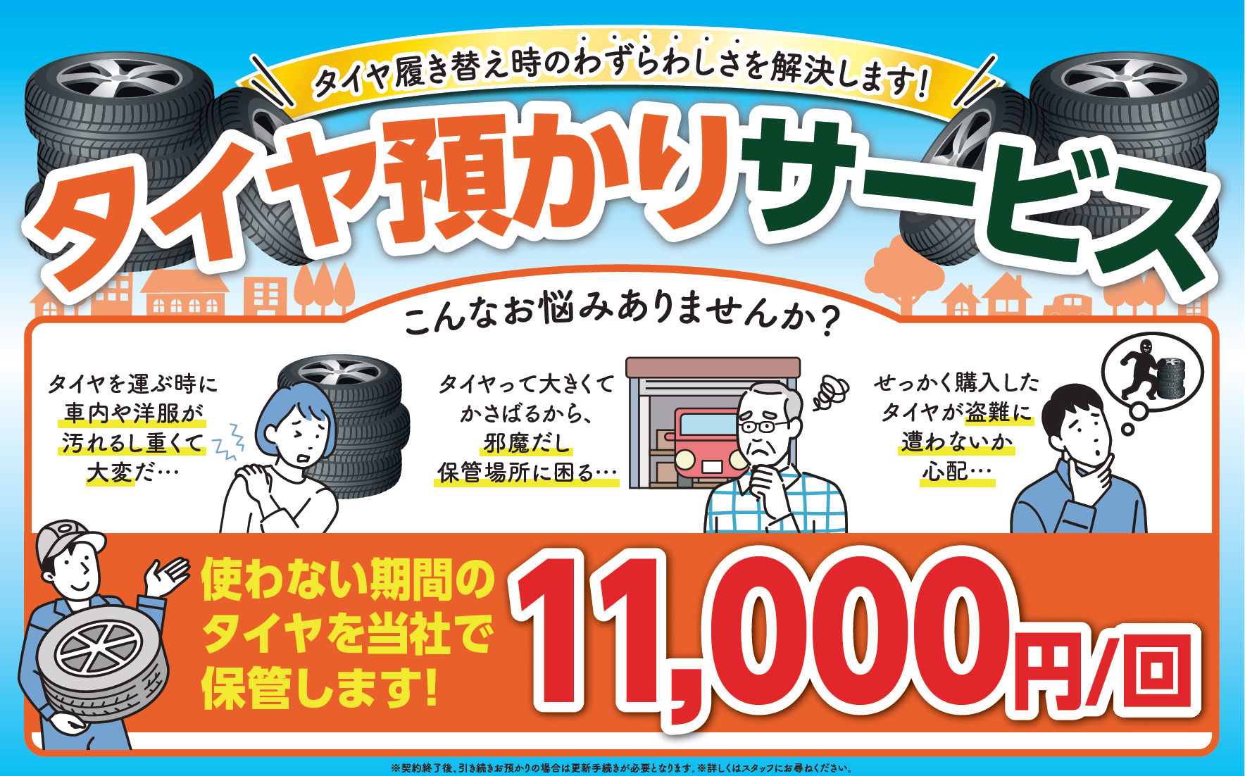 万が一、当店のタイヤ交換・取付作業が原因で不具合があった場合、保証期間内であれば無料で再整備致します。(当店でタイヤを購入のお客様、新品タイヤを持ち込み交換のお客様に限ります。)